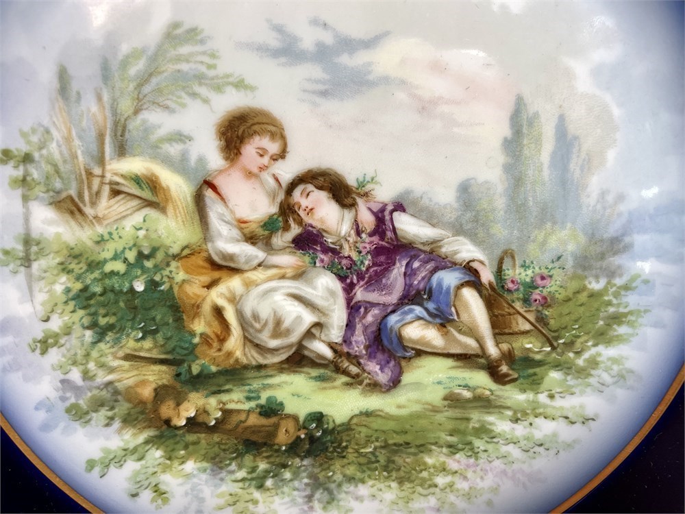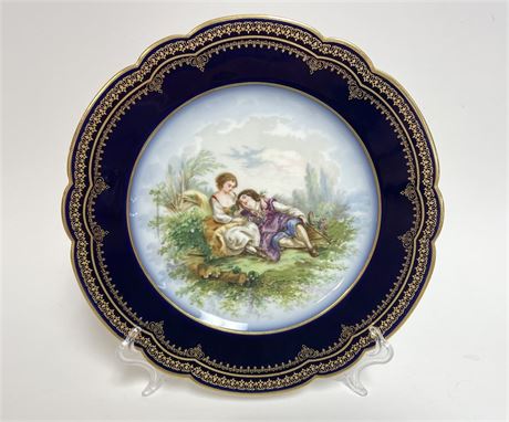 Gorgeous hand painted porcelain plate showcasing two figures in detail.  Cobalt blue rim with intricate gold trim.  Marked Sevres, see photos.  There is a shallow flake-chip on the rim on the back, not seen from the front.  9.5" diameter.  Beautiful piece.