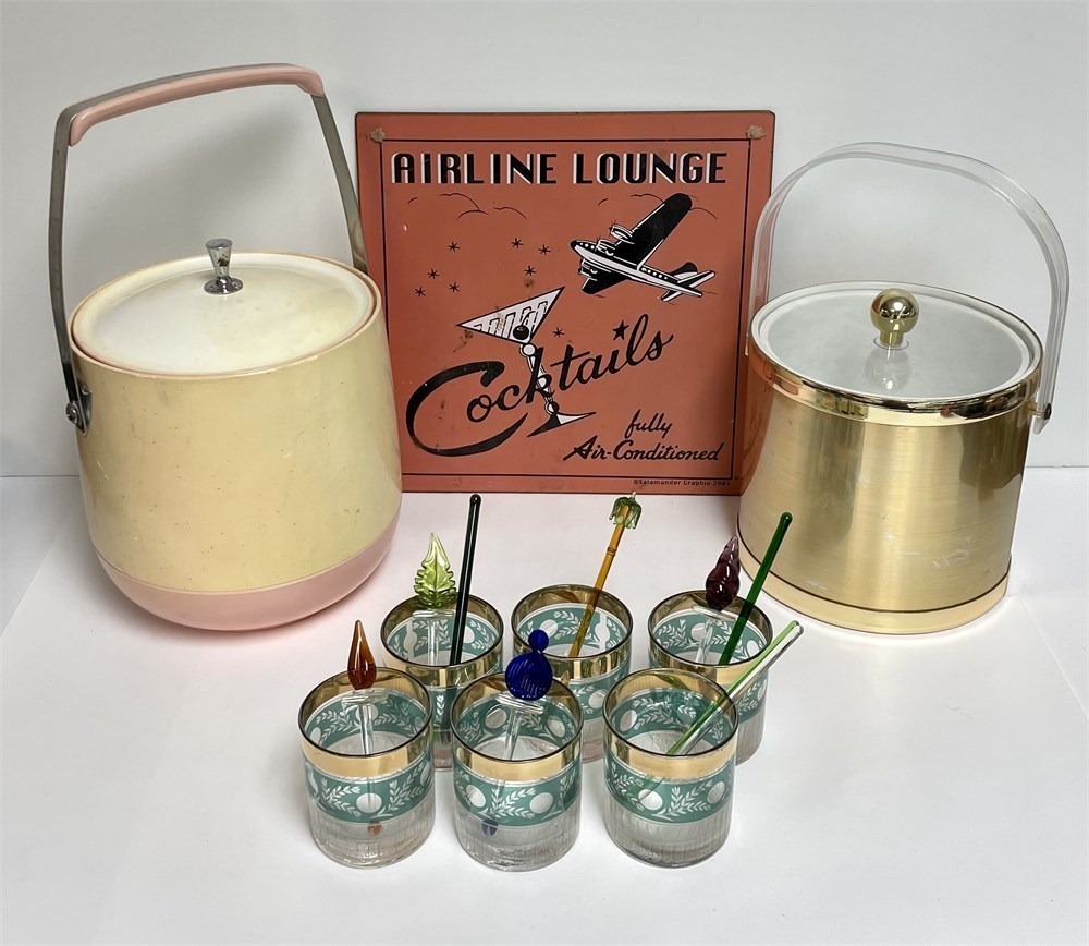 Vintage Ice Buckets, Glasses, Swizzle Sticks, Lounge Sign