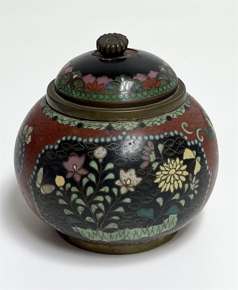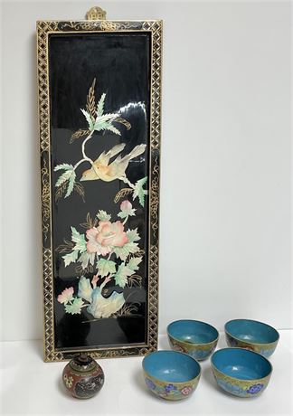 4 cloisonne bowls, two need cleaned up, otherwise they look pretty good.  A small cloisonne jar with lid; condition "as is" with some damage on the lid.  Plus the big lacquered panel with applied birds and flowers.