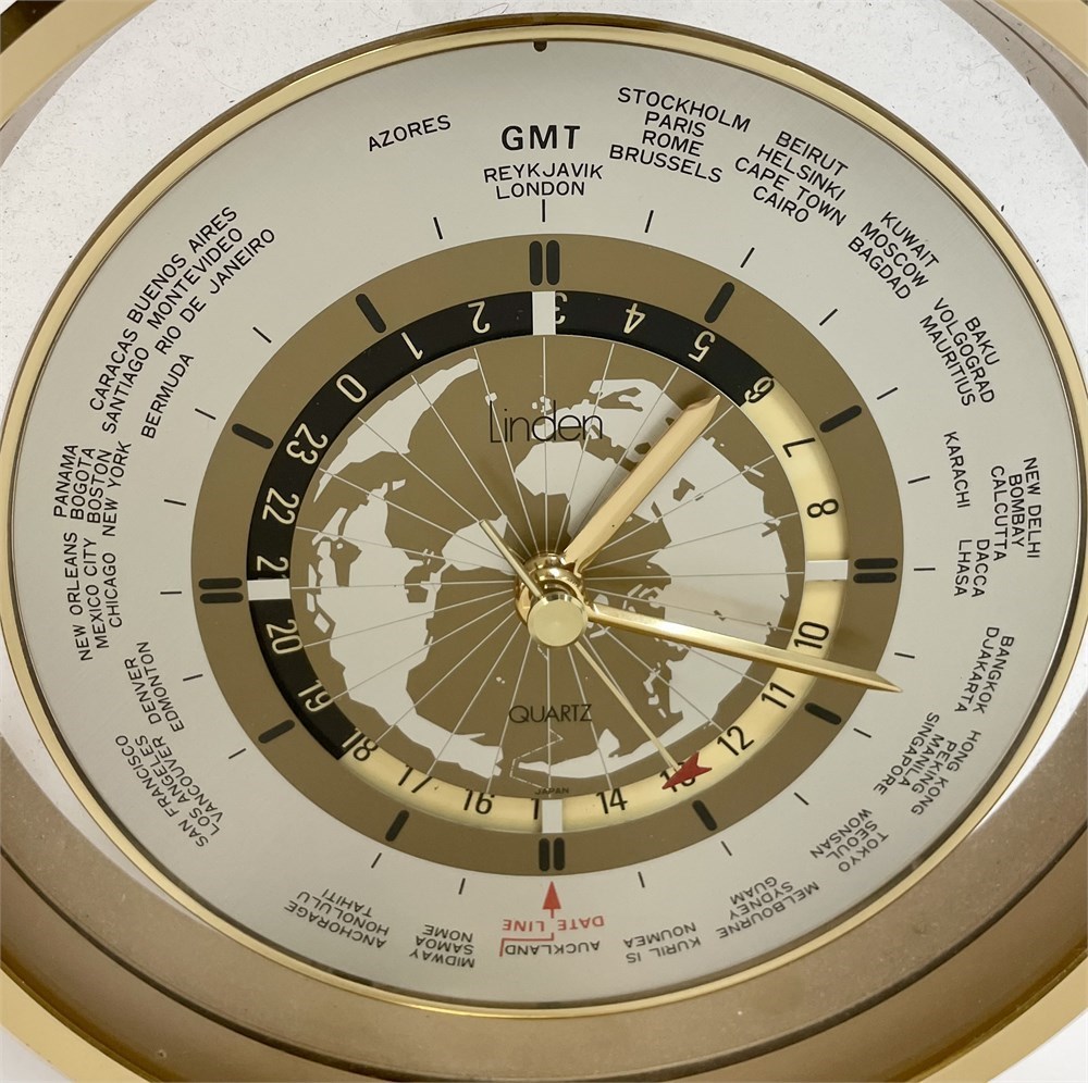 Handsome desk clock by Linden, displaying the time in cities around the world.  It looks like it would work if you just put a battery in it.