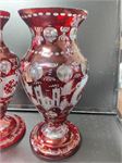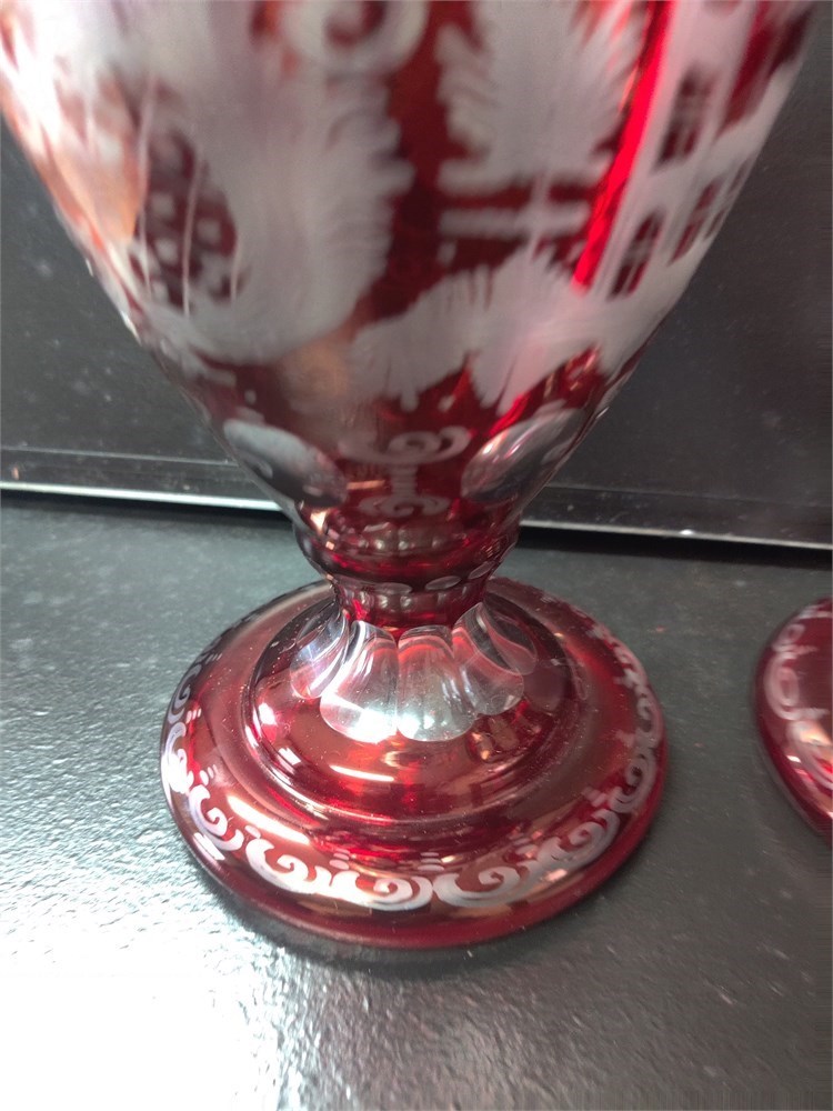 Two very nice 12-in tall Bohemia ruby glass vases. Both have similar artwork and design. The top on one is just slightly larger than the other. And both are in very good condition.