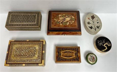7 Jewelry and Trinket Boxes Including Musical and Inlaid