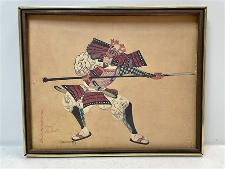 By American comedian and entertainer Red Skelton, who was also an artist known for paintings of clowns.  This one is different, a Samurai Warrior.  It's a 1972 lithograph/print on paper, framed without glass.  It's hand signed: "Enjoy, Red Skelton."