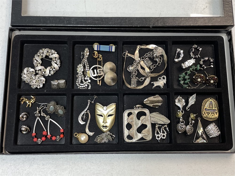 Glass-top display box, plus everything in it.  Lisner earrings, Alpaca pendant, slide, Shalom pendant, other earrings, Las Vegas style slot machine bracelet, modernist designer pendant signed Sphinx, military pins, 2 stickpins, vintage pin and earrings set signed Art, and other items.  Good group!