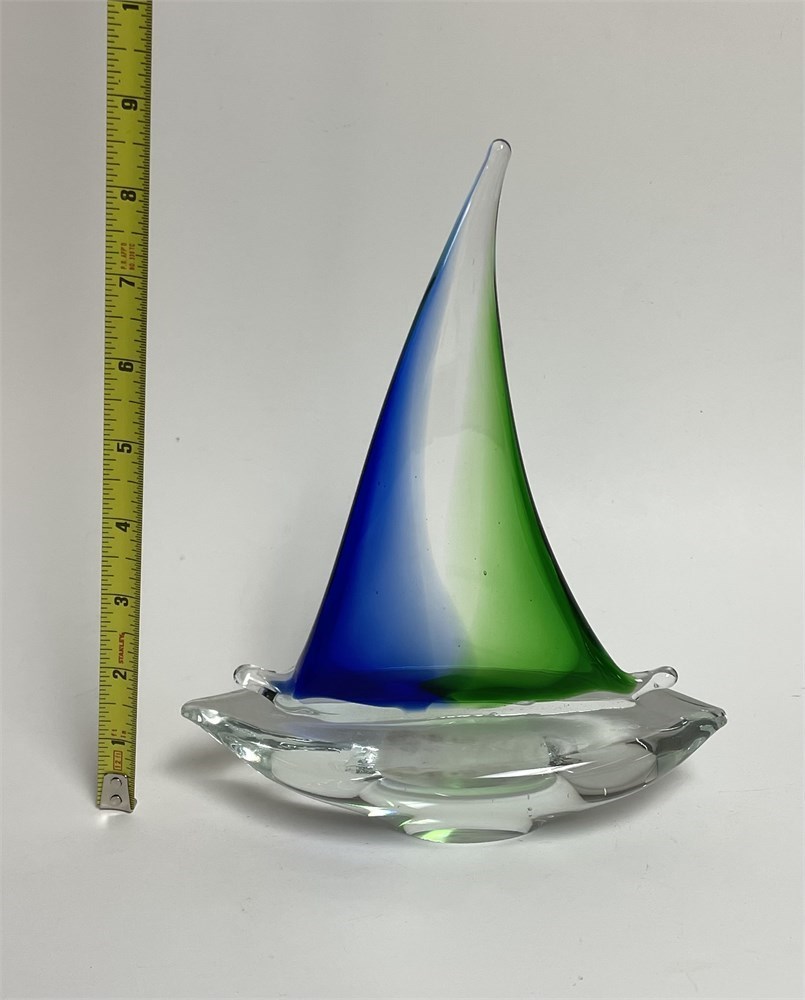 Probably Murano, no labels or signatures.  9" sailboat, 9" shell.  Notice the glasswork on the seashell.  Both are great items.