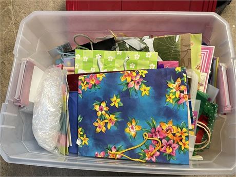 Gift bags for special occasions, birthdays, etc (very few Christmas).  MANY gift bags, and boxes, ribbon, and other supplies.  Plus the lidded storage bin!
