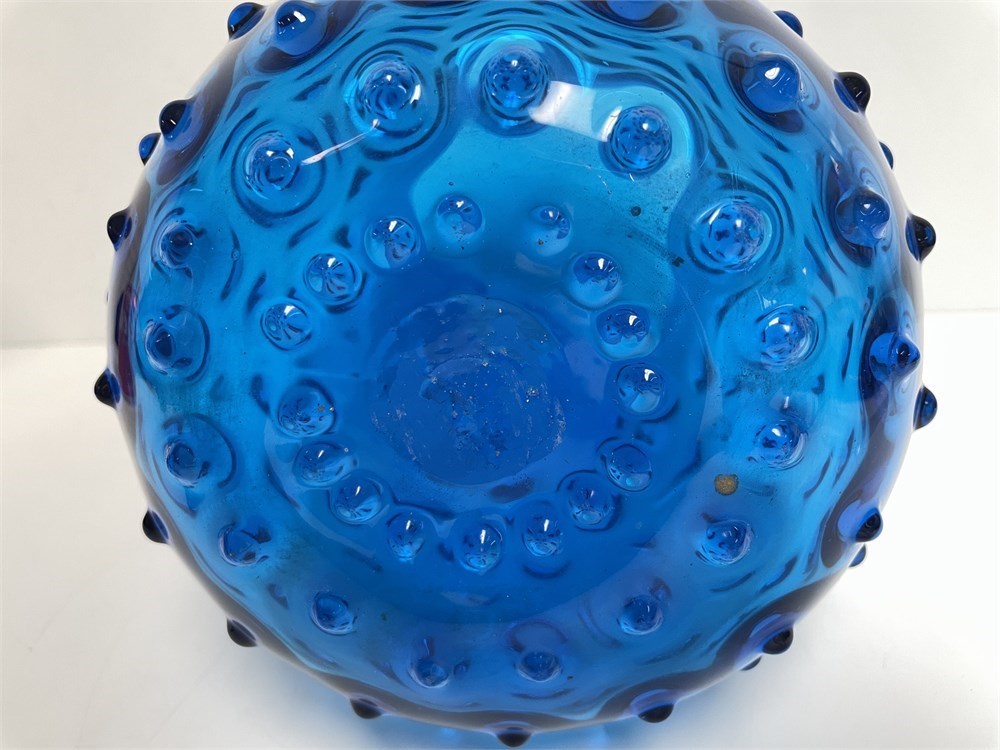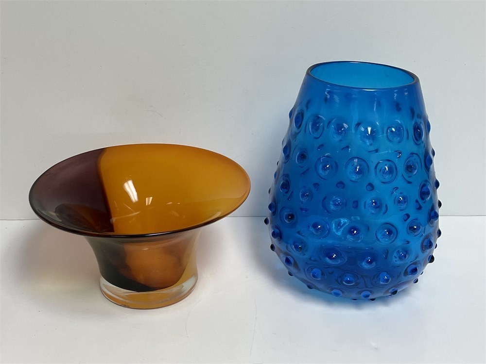 Fairly big pieces.  A tri-color bowl/centerpiece vase, and a bright blue hobnail handmade 10" vase.  See photos for details.