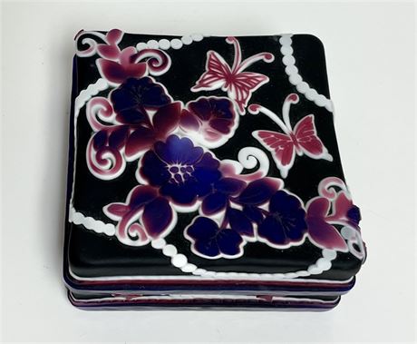 One of a kind cameo glass box by former Fenton and Pilgrim glass artist Chris Carpenter.  Its deep colors reveal butterflies, flowers, and strings of pearls.  The box is marked with a dachshund "CC Cameo" logo, as well as signed Chris Carpenter, CC10366, C A Hall.  It's also signed and numbered inside the lid.  There are a few little nicks on the rim inside the box (not bad at all, and not seen with the lid on).  Box is about 5.5" square.