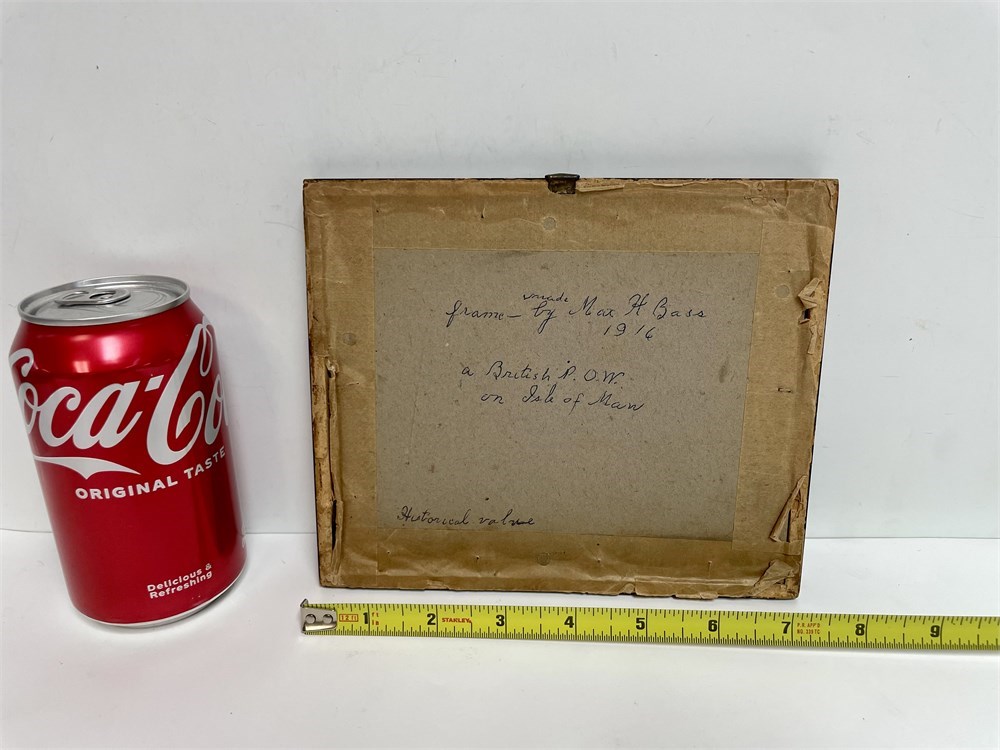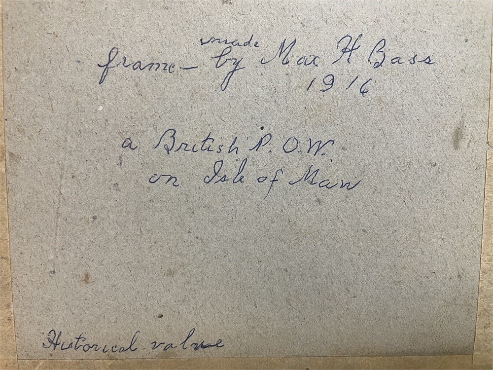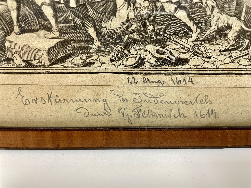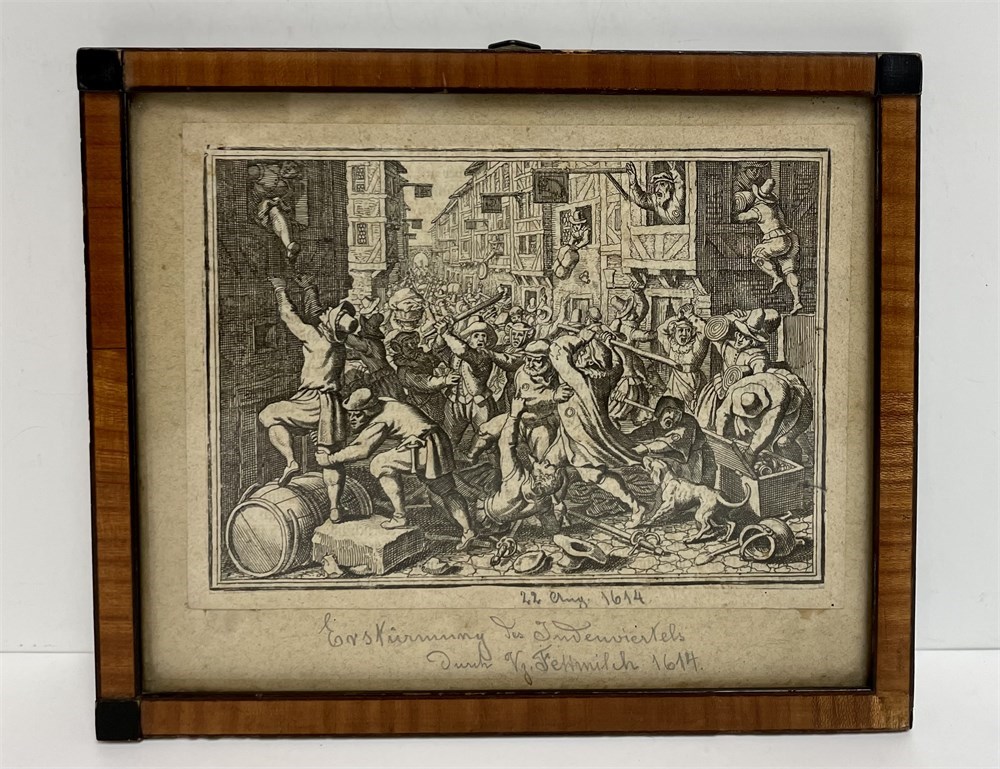 Matthaeus Merian (1593-1650).  Riot in the Judengasse, Frankfurt in 1614.  An image of the Fettmilch riots on August 22, 1614, when a mob armed with clubs attacked residents of Jewish Lane.  This is a small artwork, and has a written notation on the back: “Frame made by Max H. Bass, 1916, a British P.O.W. on Isle of Man; Historical Value.”