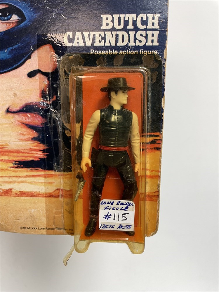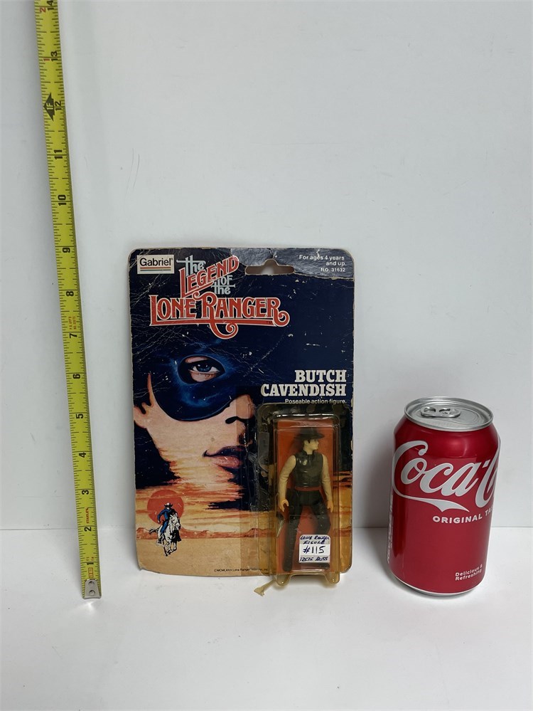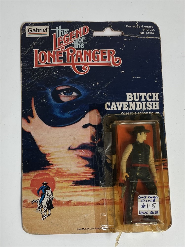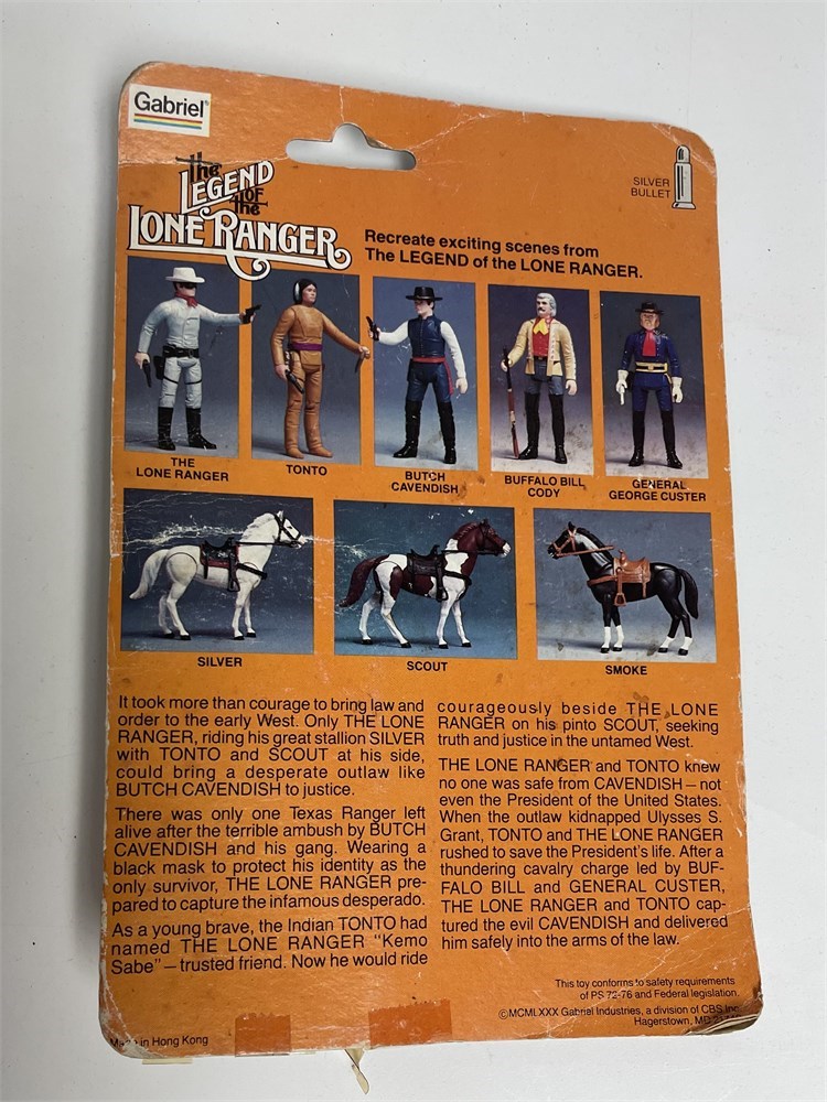 Vintage Gabriel figure from The Legend of the Lone Ranger 1981 film.  Package has been taped, and has an old secondary market price tag of $115.  Gun is present with the figure.