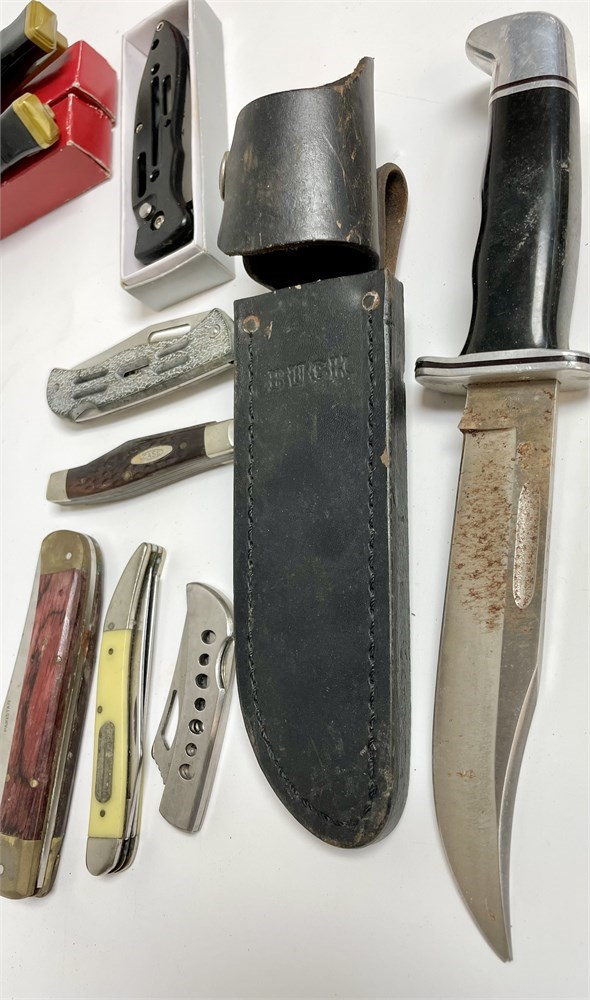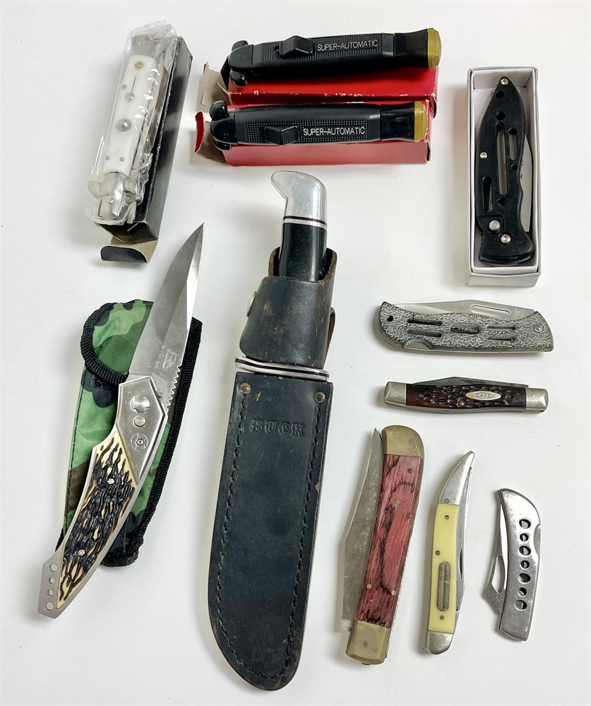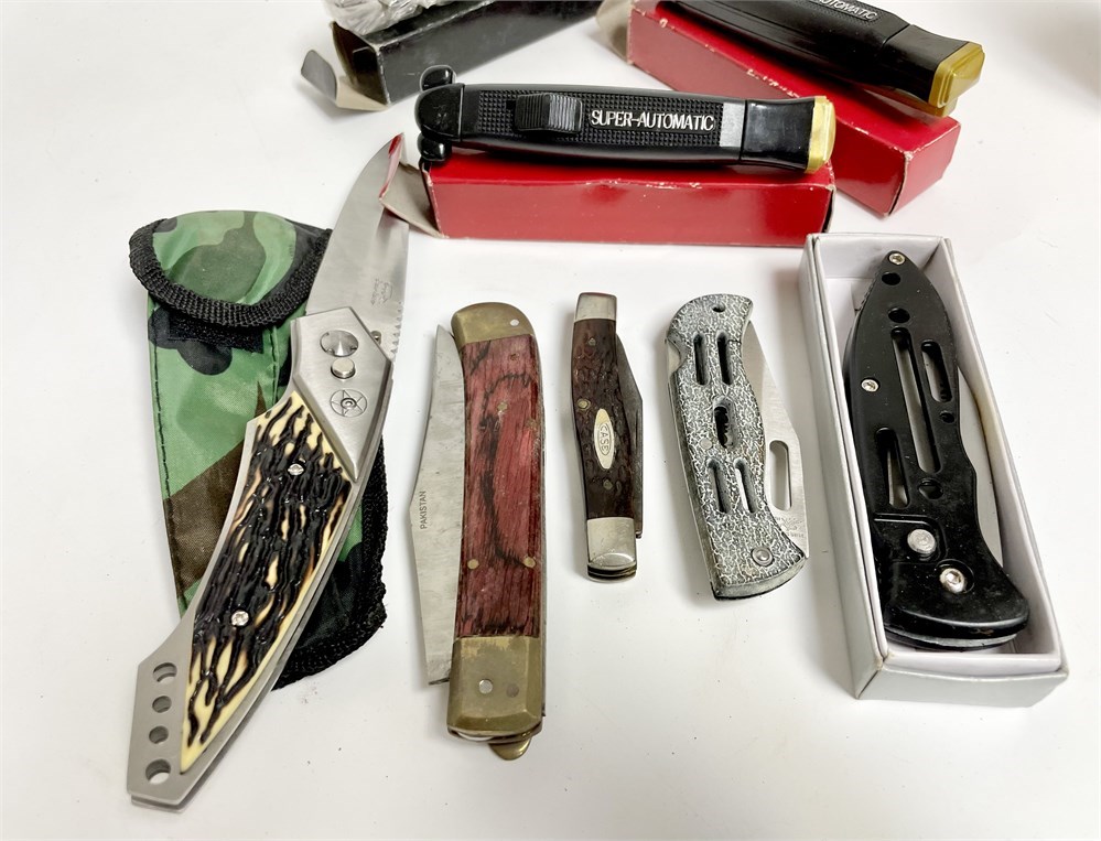 Pocket knives, automatic knives, fixed blades.  Some in used condition and some like new.  Buck, Case, Pakistan, others.