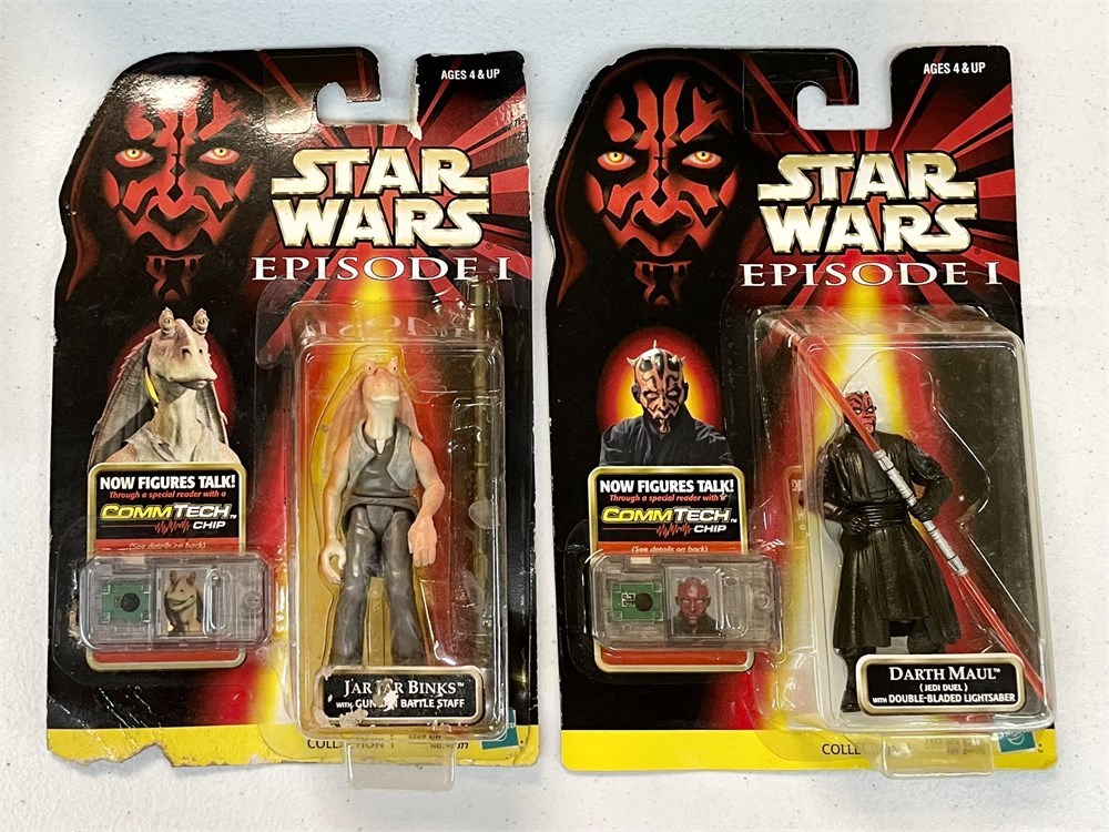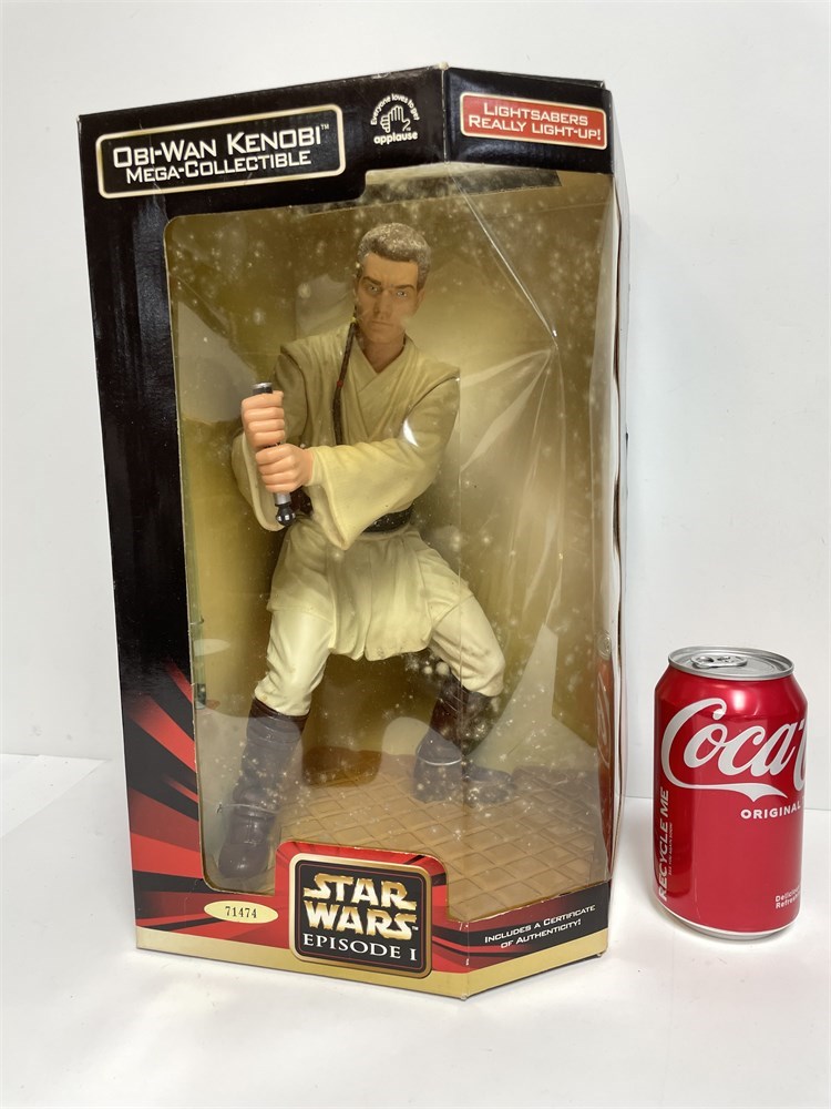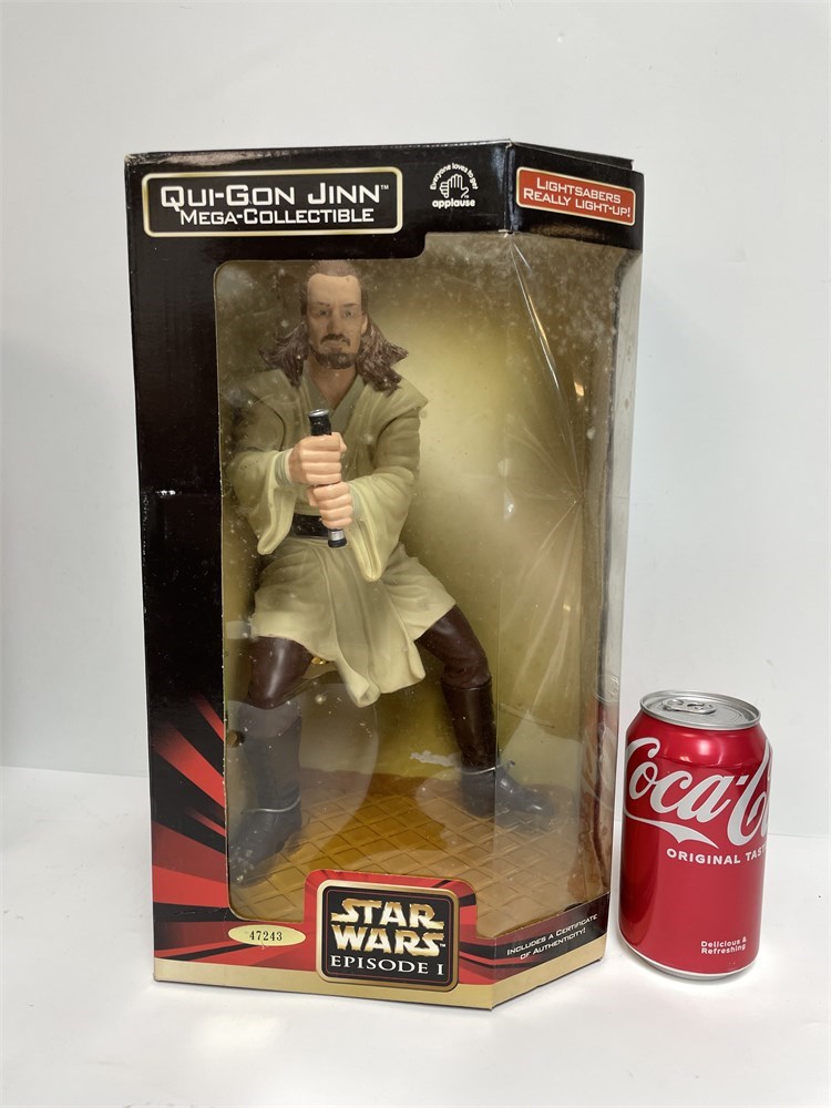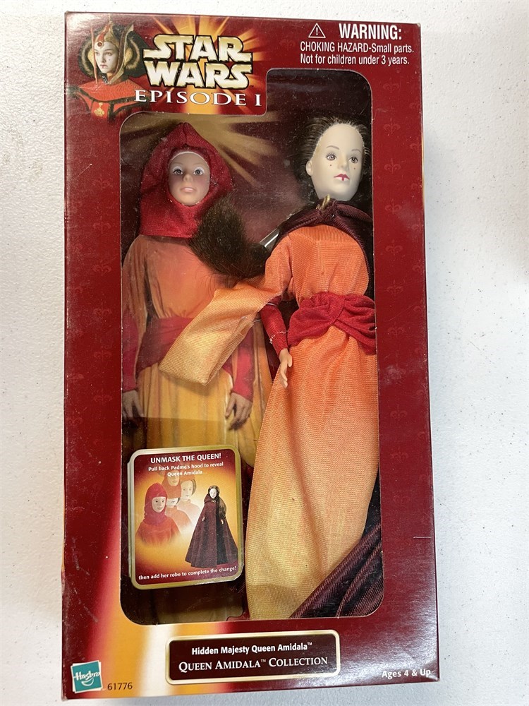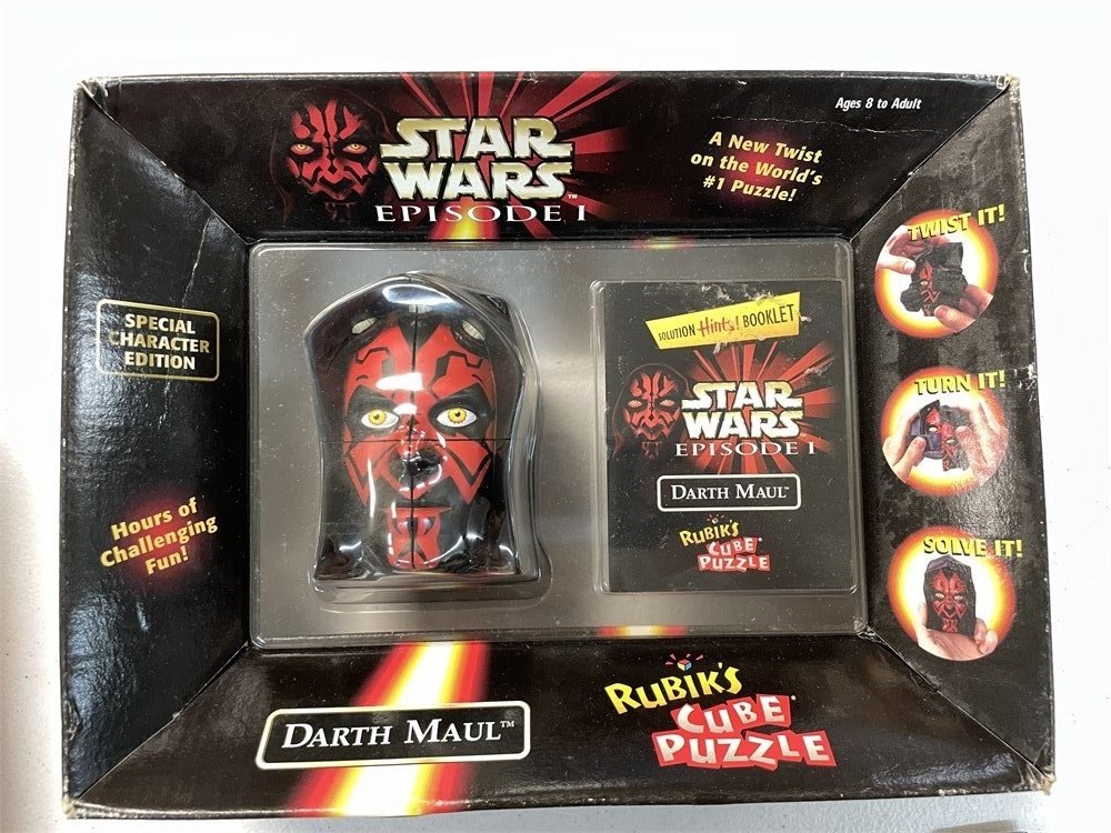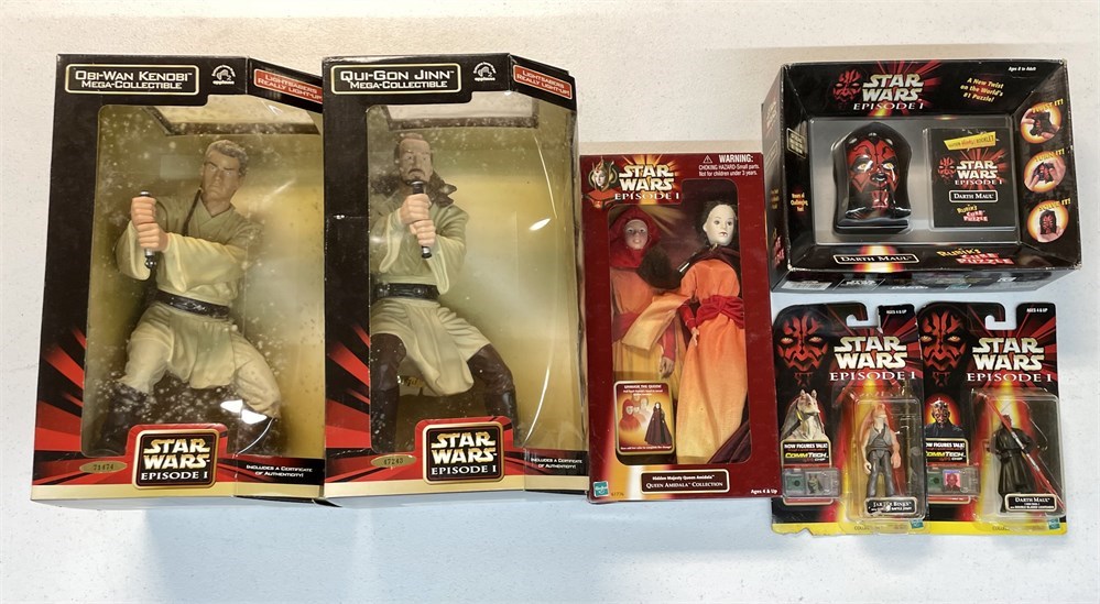 Obi-Wan Kenobi and Qui-Gon Jinn larger figures in display boxes.  Queen Amidala figure set.  2 smaller figures, and a Rubik's Cube Darth Maul puzzle.  See photos for details; these were garage kept, have flaws or need TLC.