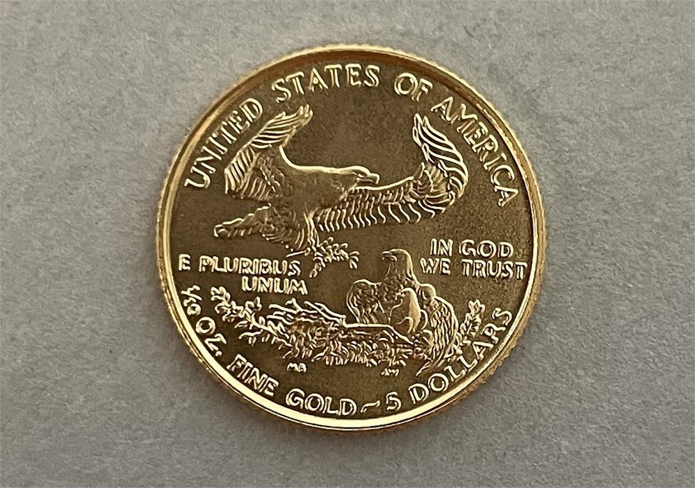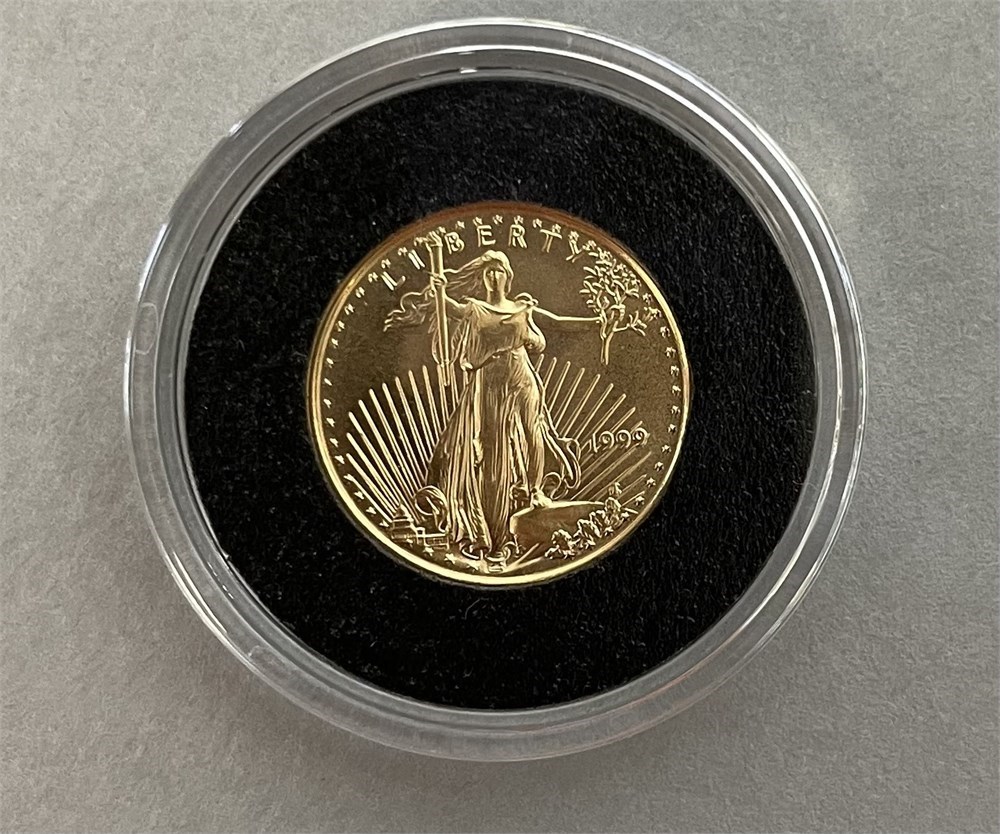 1999 U.S. Gold Eagle $5 coin, 1/10 oz.  The actual coin is pictured, and it's in an Air-Tite capsule.