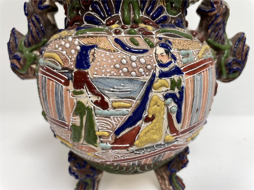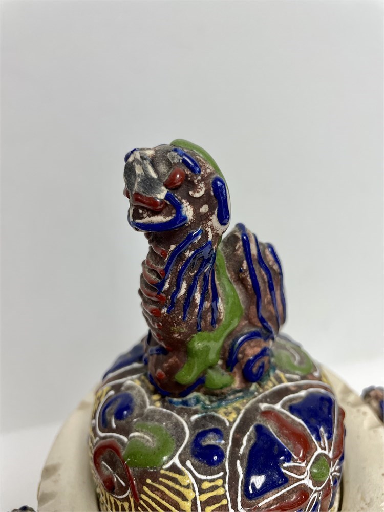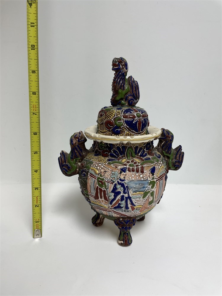 The three-legged urn with foo dog handles and lid is about 9.5" tall, mostly good condition, but the top foo dog has damage on its face that is disguised pretty well with color.  Overall its looks pretty good.  It's an older piece, interesting moriage decoration.