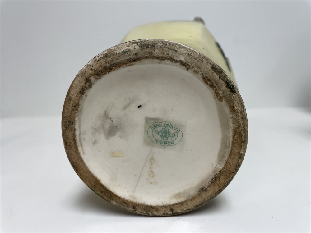 The 12" Nippon Miyako vase is badly damaged, and glued back together all over.  Consider it free with the other two pieces.