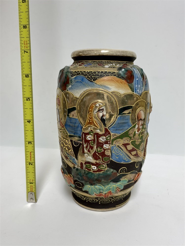 The 7" vintage Satsuma vase is in good general condition, with scenes all around, and gold highlights (showing some wear).