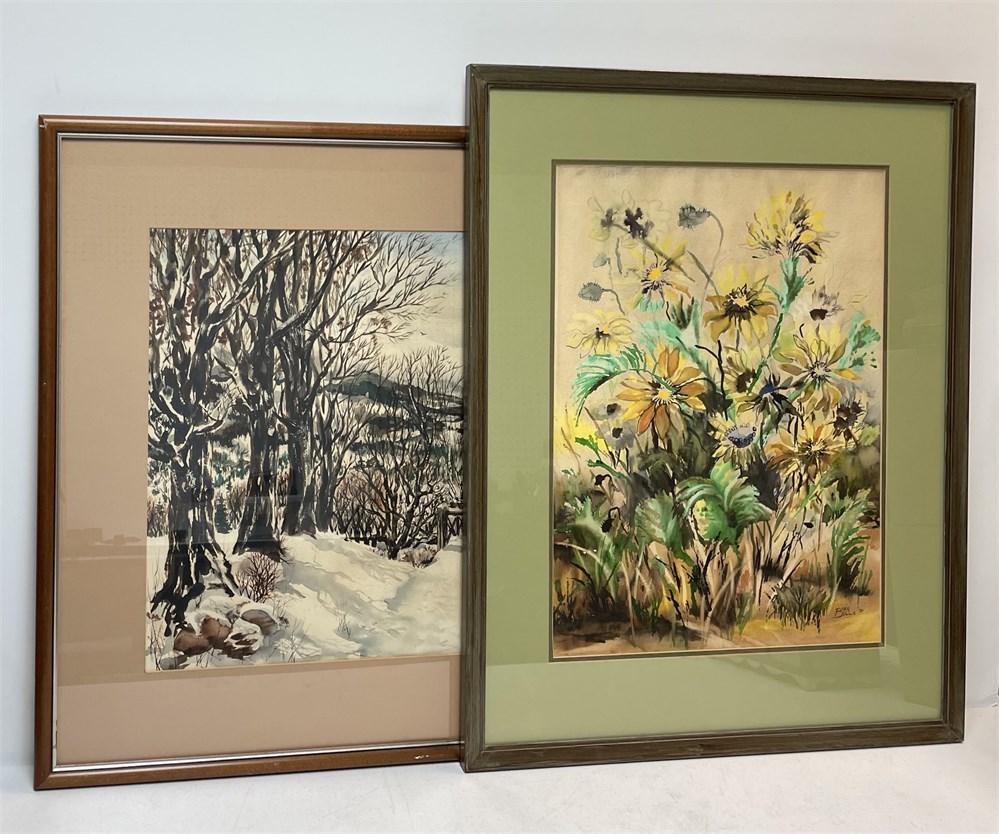Mid-century watercolor on paper, two artwork pieces by the same artist.  Both signed Barb Bills.  Framed under glass.  Fairly large pieces, see photos.