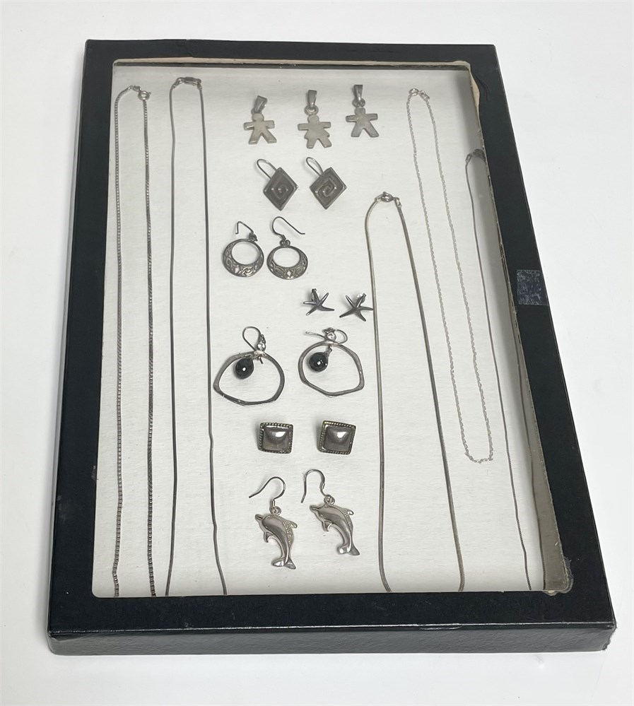 Sterling silver jewelry group includes 5 chains, 3 "child" pendants, 6 sets of earrings, all marked as 925 sterling silver.  Notice the cute dolphins!  Plus the glass-top display box they're in.
