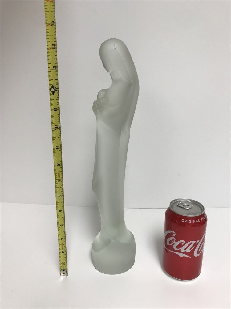 Art Deco Leerdam Holland sculpture of Mary holding Jesus, frosted crystal.  The designer is Stef Uiterwaal; it's signed GU/SL (see photo) in molded relief.  No chips/cracks.