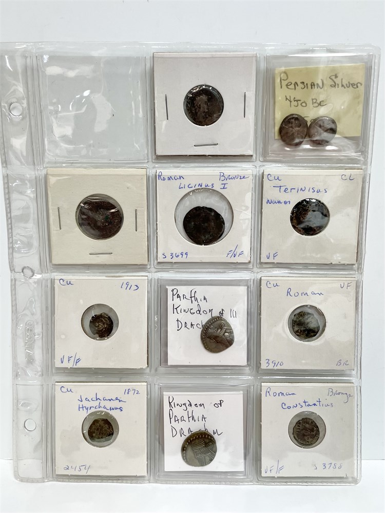 A sheet of 12 coins, and most are identified by the original collector.  Roman, Persian silver, Parthia Kingdom drachm, others.