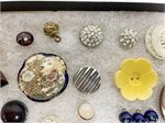 An estate collection of assorted buttons.  2 small ones have backs that are marked as 14K gold.  The nice Satsuma piece is not actually a button because it has a flat back.  Some are Murano style glass; there are nice carved mother of pearl ones; a Bakelite fruit; various others.  Selling the whole group as found, including the glass-top case they're in.