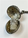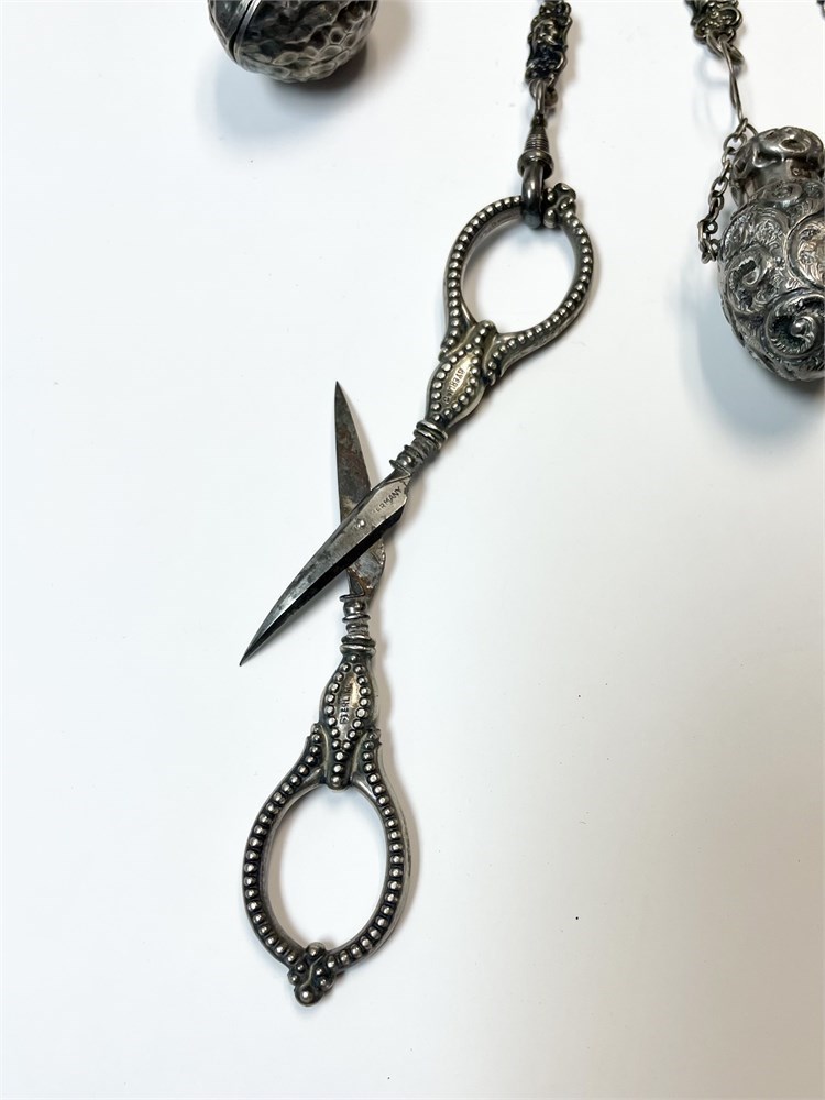 A fancy EPNS chatelaine with 5 attachments.  The scent bottle is sterling silver with English hallmarks.  The walnut holds a beautiful ornate thimble.  The German scissors are marked Sterling.  Plus there is a needle case and unusual pincushion.  The chatelaine clip features birds, scrolls, faces, grape clusters, and more.