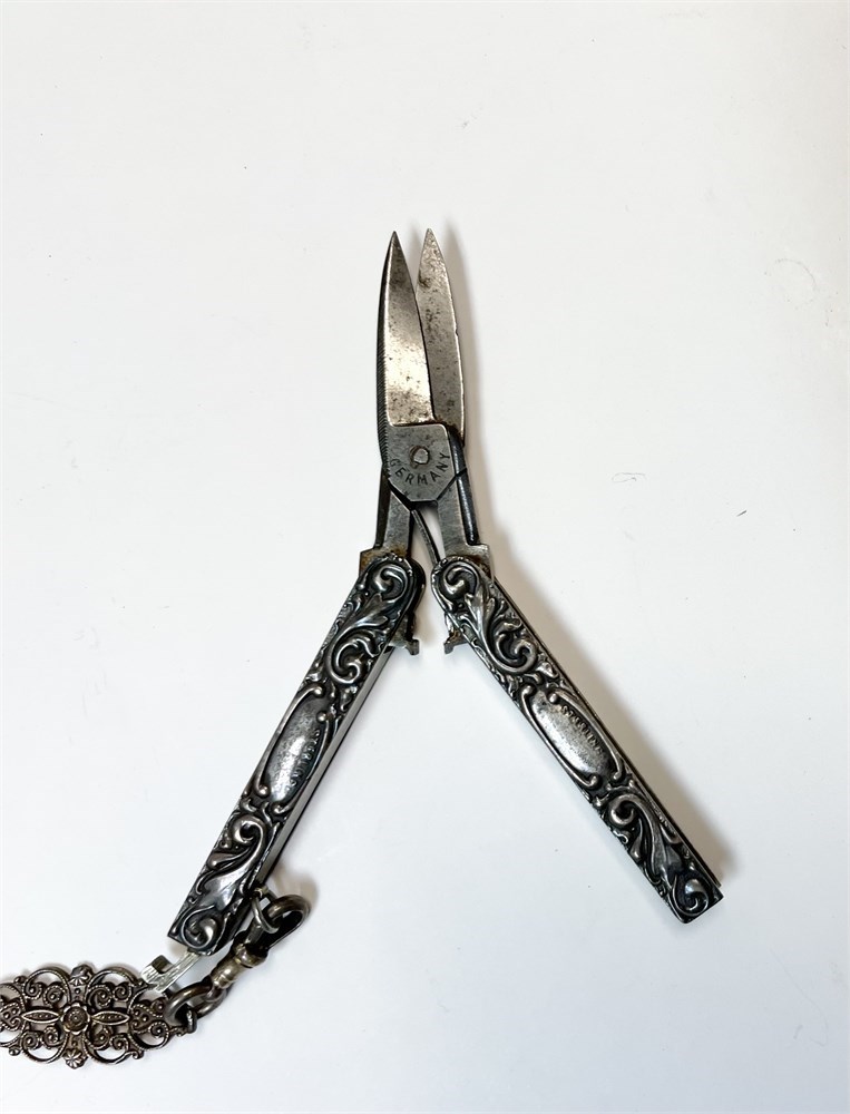 A lovely antique chatelaine with 5 attachments.  There are small German folding scissors, marked Sterling; a strawberry pincushion (fabric is discolored); and a needle case with chain.  Also a monogrammed implement marked Sterling, and a silver thimble case marked Sterling and F&B.  The chatelaine clip features a bird alighting on a branch, with the fancy chains descending from it, unmarked.