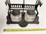 Iron double lidded inkwell with both glass bottles present and in good condition.  It has a patent date in the 1800's.