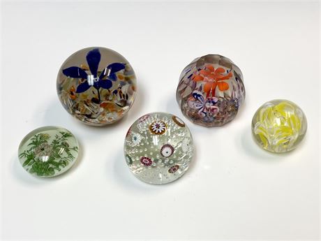 5 paperweights.  The small yellow one has a significant crack.  The others are basically ok, although in "used" condition with wear, scratches, little nicks, etc.  No signatures found.