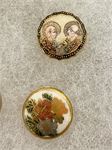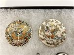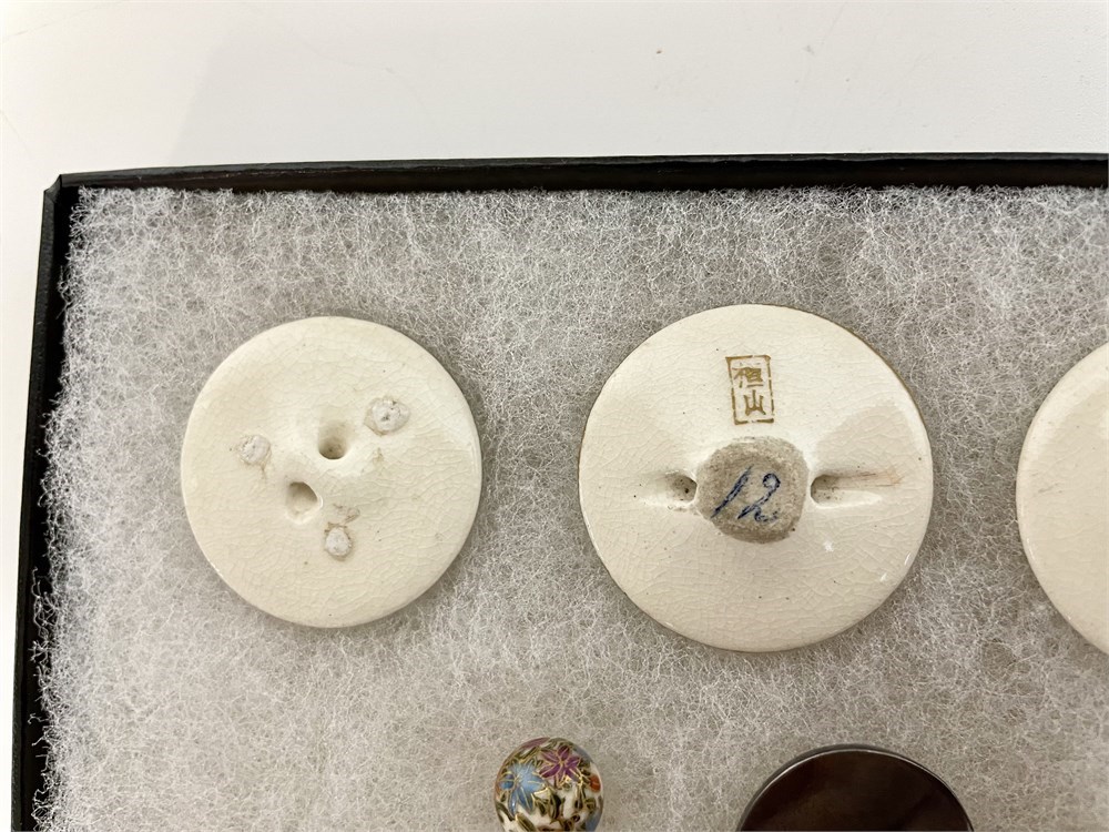 A stunning collection of hand painted Japanese Satsuma buttons, full of detail and rich scenes and portraits.  We are selling these buttons in the display case as we found them in the estate.  Notice the wonderful variety: a lady with butterfly wings, Geishas, a dragon, a set of 5 small dragons, a bird on branch, several floral, one scenic with mountains and boats, two filled with butterflies, several with lovely ladies or groups of people.  Notice too the ball shaped button, 2 others that are not the typical round shape, one that's especially tiny.  See the various marks in the photos.  Several have the mark of the Shimazu family, some are kanji signed, some have other marks or cobalt blue backs.  A fantastic collection, well worth your bids.
