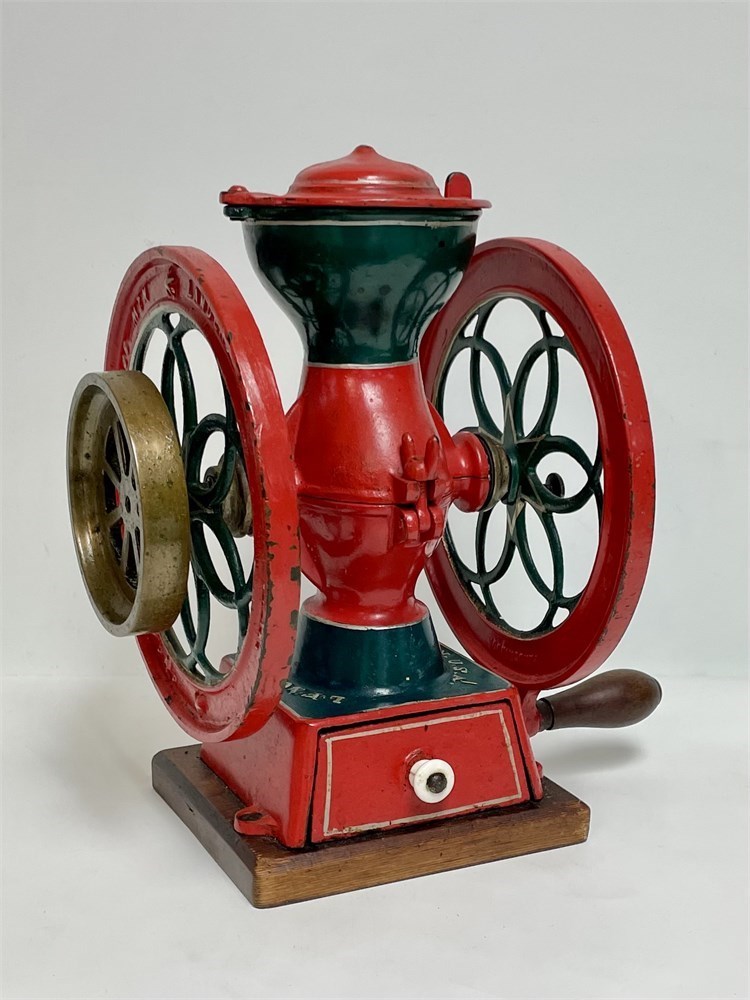 A cast iron double wheel coffee mill in brightly colored paint.  Landers Frary & Clark, New Britain, Conn.  For use on a store countertop.  Marked "Oil the Balls" on the back.