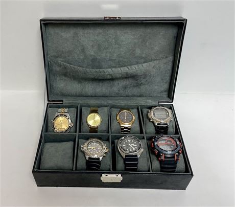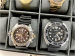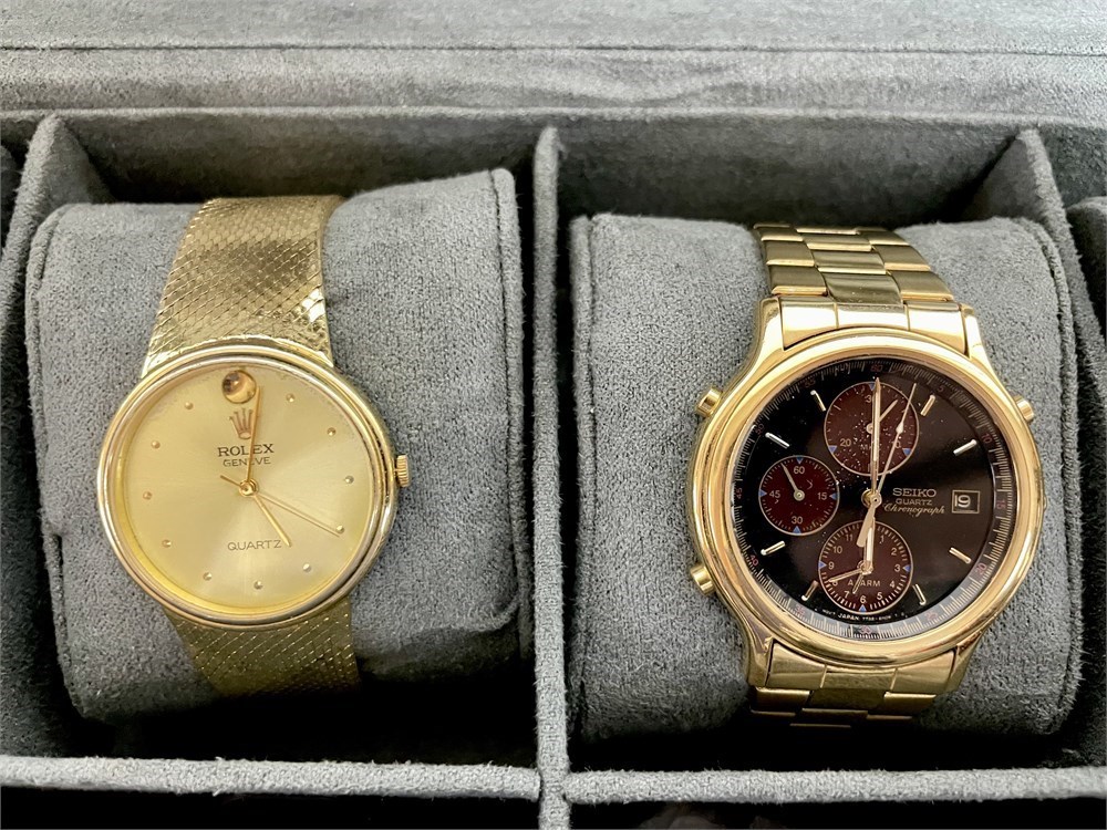 2 are running, and the others apparently need batteries.  Armitron, Citizen, Seiko, and an imitation Rolex.  A nice looking group, with a storage box to keep them in.