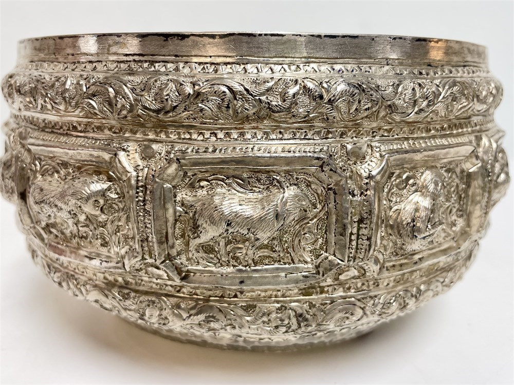 Handmade repousse silver footed bowl from Burma (Myanmar) with a variety of animals featured around it.  Good condition.  Marked on the bottom as pictured.