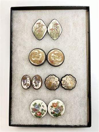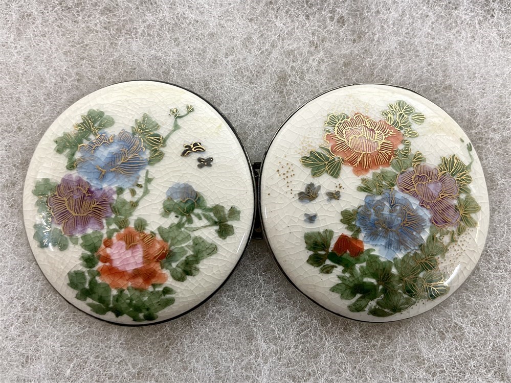 Miniature works of art!  5 matched sets of hand painted Japanese Satsuma porcelain buckles.  Subjects include dragons, birds and irises, scenic floral, flowers with birds and butterflies.  2 have the mark of the Shimazu family, and 2 other sets are kanji signed, and one set is unsigned.