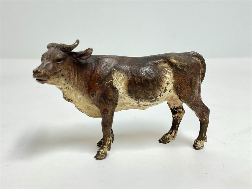 A small bronze cow sculpture, painted.  Probably Austrian, no marks found.  About 3" tall.