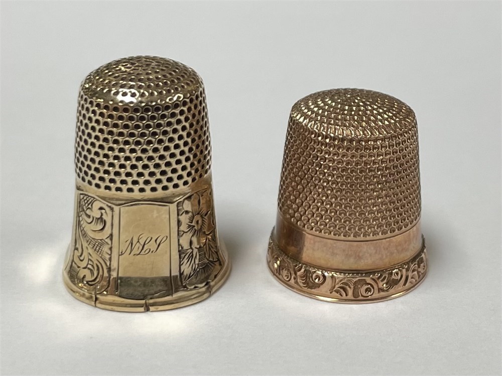 2 sewing thimbles, one is marked for Ketcham & McDougall, and the other has no maker's mark.  They both test as 14K gold.