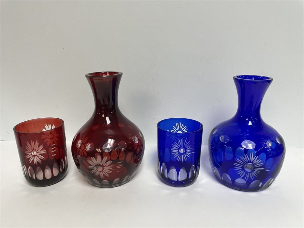 All in good condition with no chips/cracks.  No signatures; probably from Czechoslovakia/Bohemia.  Cut to clear glass including cobalt blue, amethyst (light purple), and ruby red.  Two water carafe sets with tumblers; an ashtray; a bud vase; and a 8.5" flower vase.