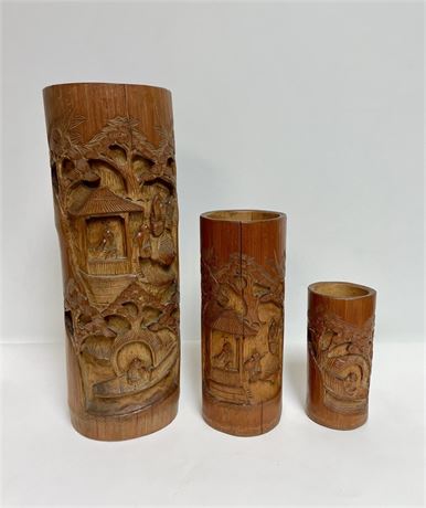Chinese carved bamboo vases (or brush pots), ranging from 13.5" to 5.5" tall.  The middle sized one has noticeable splits; the others have typical cracks/splits too but not as detracting.