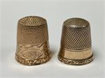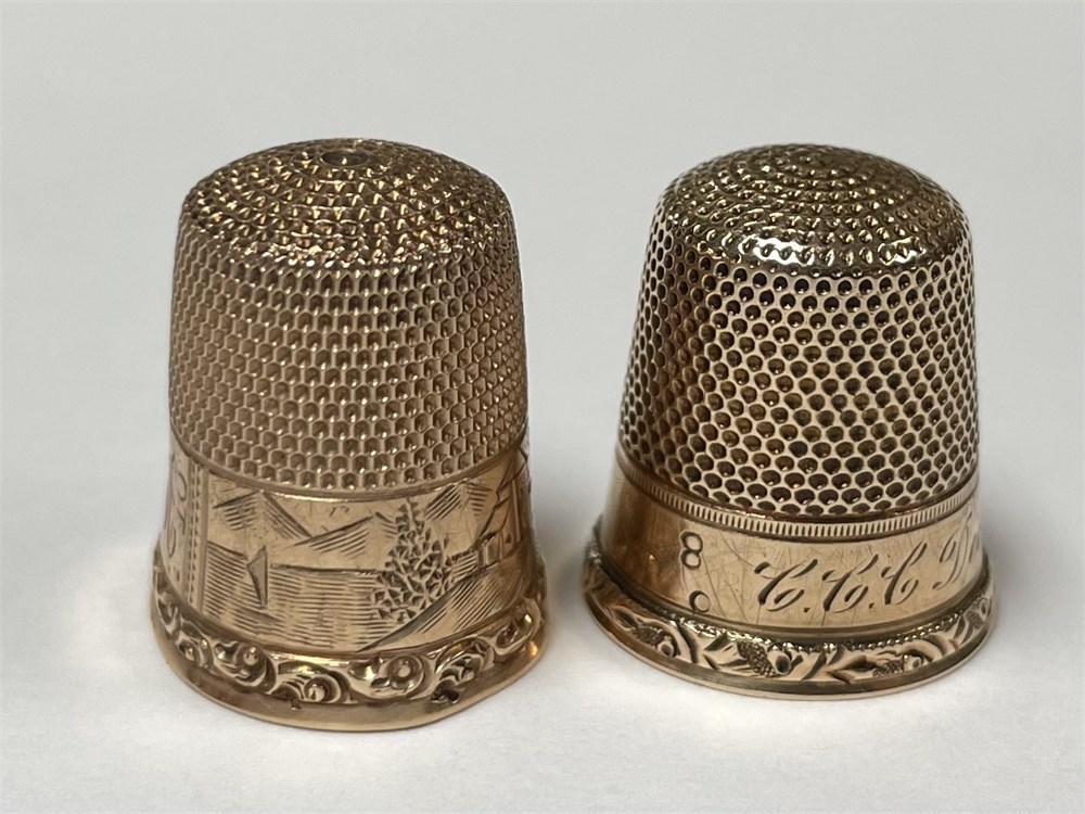 2 sewing thimbles, the engraved scenic one is marked for Simons, and the other has no maker's mark.  They both test as 10K gold.