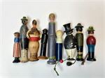 A wonderful group of old needle cases, each shaped like a person.  All are wood except the small straight-body girl (she is plastic and made in France).  Notice 3 have pull-cords which tighten their hats onto their heads.  Really unusual!  Plus various others; see photos for the variety.  9 pieces total.