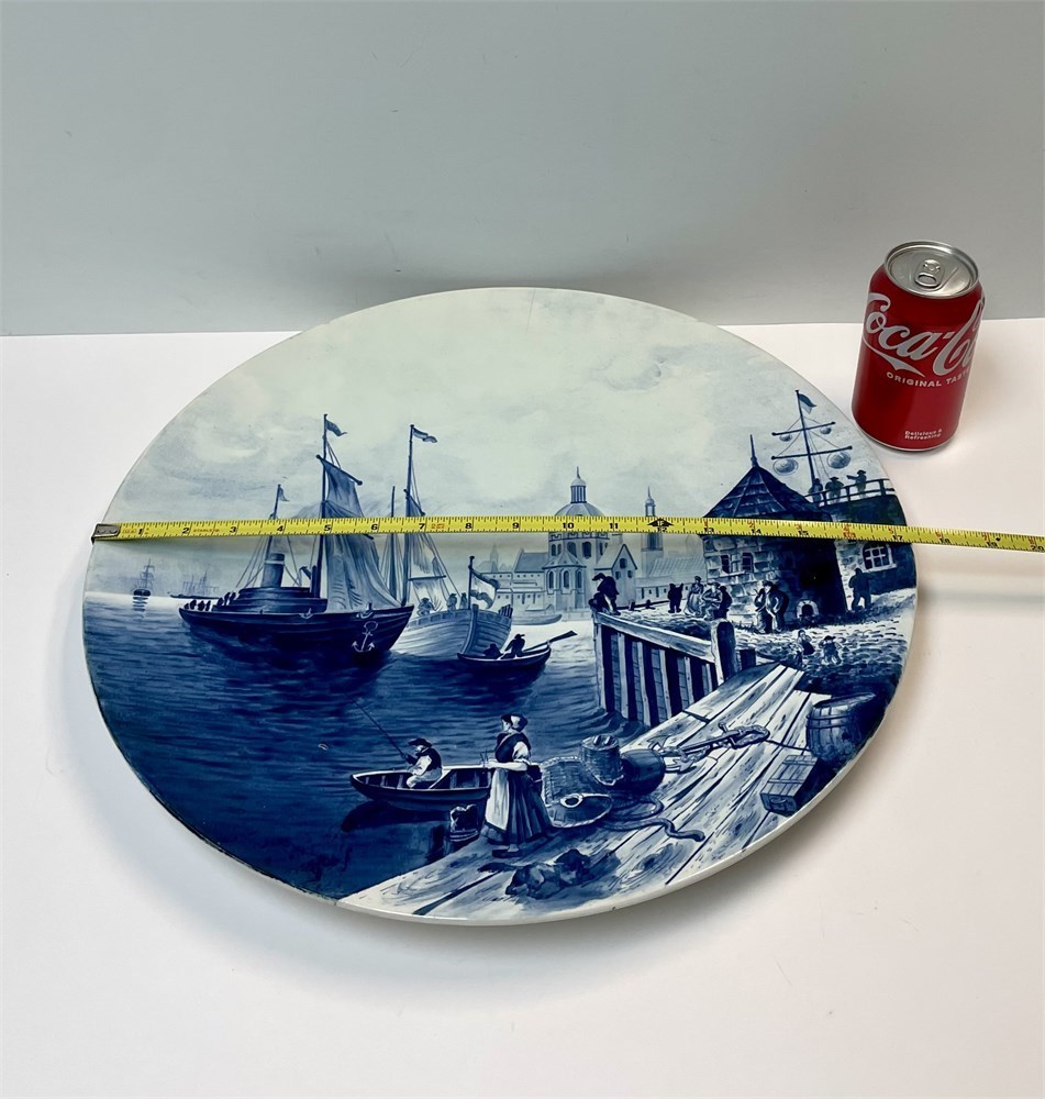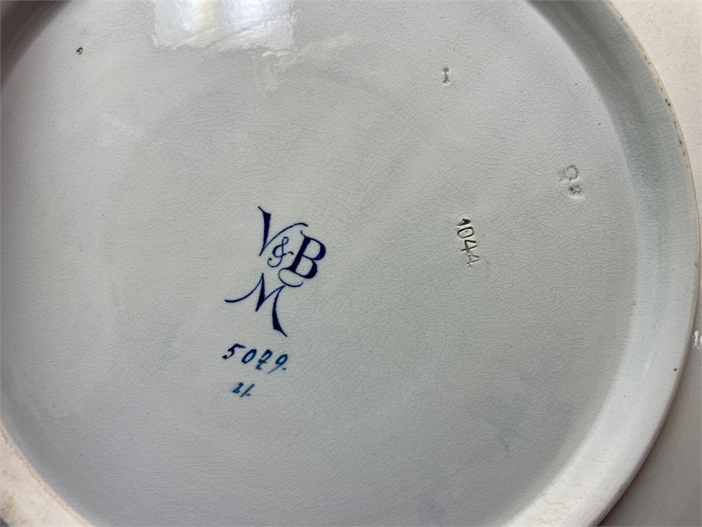 An extra-large charger plate, about 17" diameter.  Made by Villeroy & Boch circa 1880-1900, a Delft-style blue-and-white German plate, with wire for hanging.  There is a hairline crack at the top; not overly distracting.  Marked as pictured.