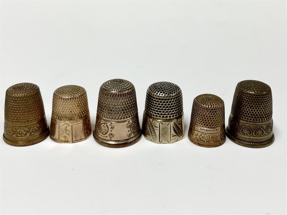 A group of sewing thimbles, various makers including Simons Bros.  Sterling, gold-filled, engraved, Victorian, brass, Germany, England, others.