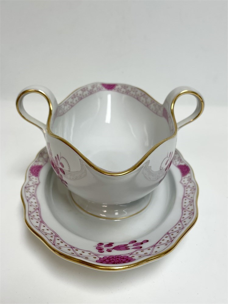 Meissen Purple Indian fine porcelain gravy boat with attached underplate.  Hand painted with gold trim, in good condition with no chips or cracks.  Marked as pictured, with crossed swords and hand written numbers.