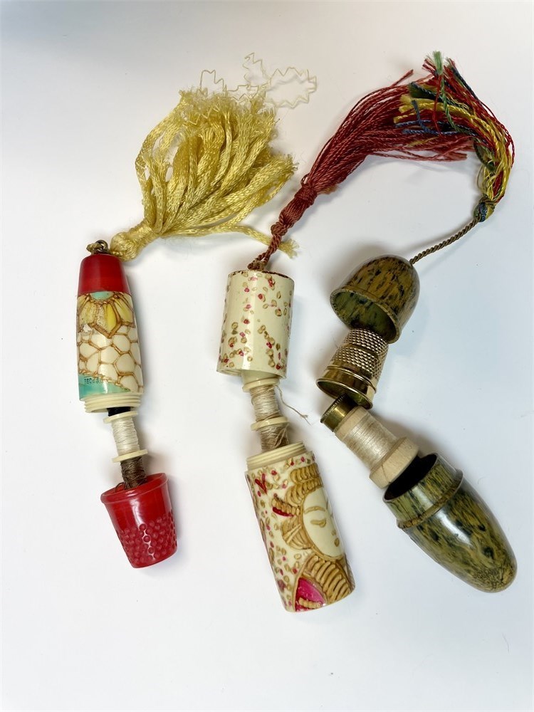 Older sewing kits or needle/thread cases, made of plastic or similar materials, maybe some Bakelite.  Many have their contents such as thread and thimbles.  Lots of variety including Asian style, handpainted, jeweled, tasseled, and others.  Some showing wear or flaws; see photos.  Markings include Germany, France, England.  39 pieces total.