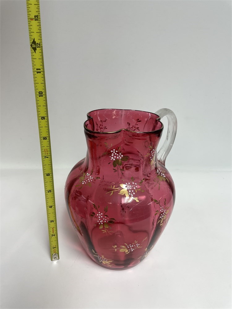 Antique Cranberry Glass Pitcher and 2 Tumblers