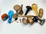 An assortment of sock darners, and 3 are mini sized glove darners.  Wood, glass, plastic - a variety.  One handle is marked Sterling.  15 pieces!