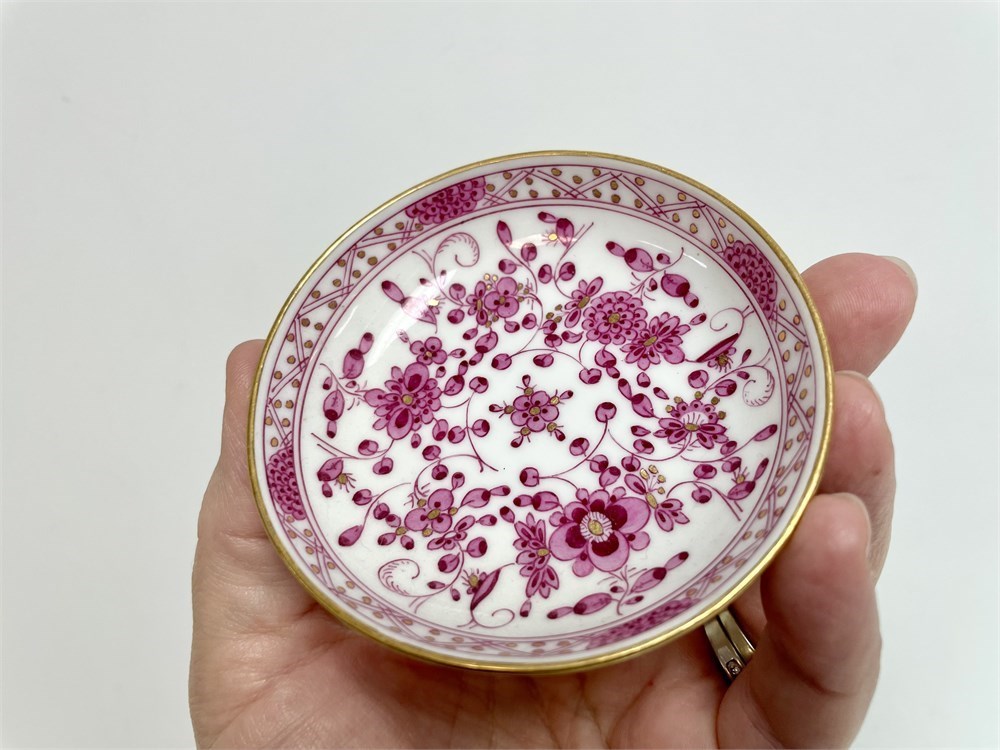 4 Meissen Purple Indian porcelain dishes in different shapes.  Sized about 4.5" and under.  Trinket dishes, and the smallest is possibly a butter pat.  All are in good condition with no chips or cracks.  See photos for the variety of crossed sword marks.