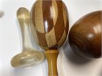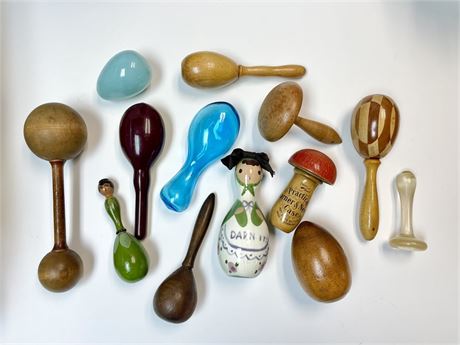 An assortment of sock darners including a ceramic "Darn It" doll, a mushroom style needle case, and 3 glass ones.  (The light blue egg is blue milk glass.)  Plus wood and plastic ones, a good variety.  13 pieces!