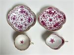 Meissen Purple Indian porcelain: 2 teacups, 2 saucers, and an extra slightly larger saucer.  The demitasse size teacup sets are in two different styles/shapes, but the same pattern.  All pieces are in good condition with no chips or cracks, and nice gold trim.  See photos for the variety of marks.