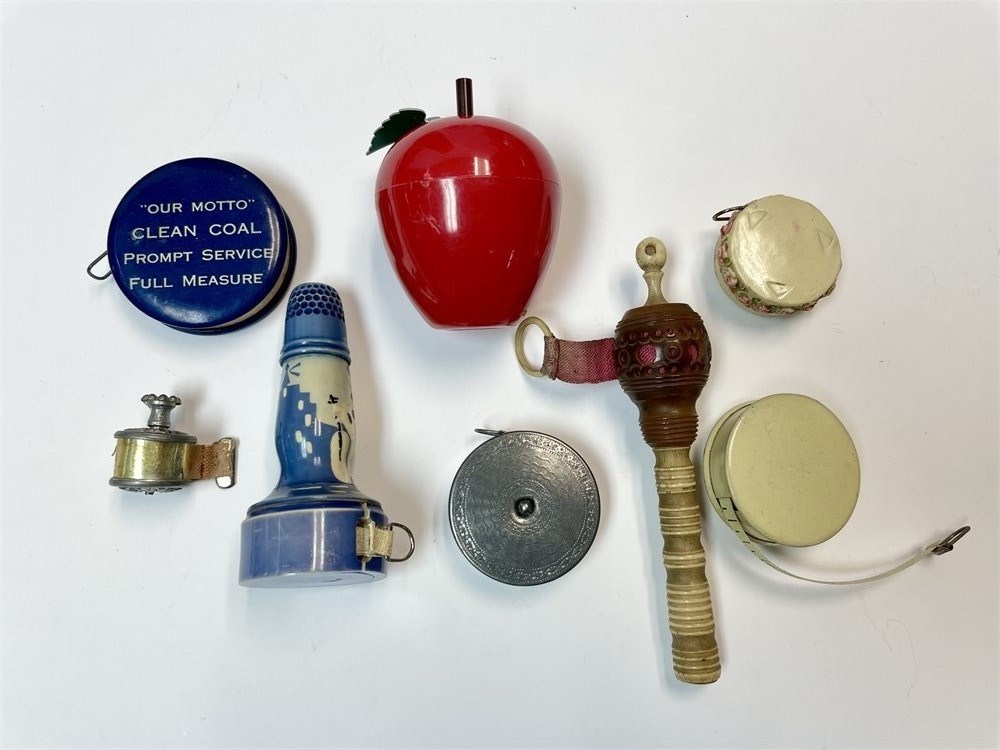 8 assorted measures including advertising, a combo with sewing kit, a cute apple, and one hand carved.  Please see pics for details.